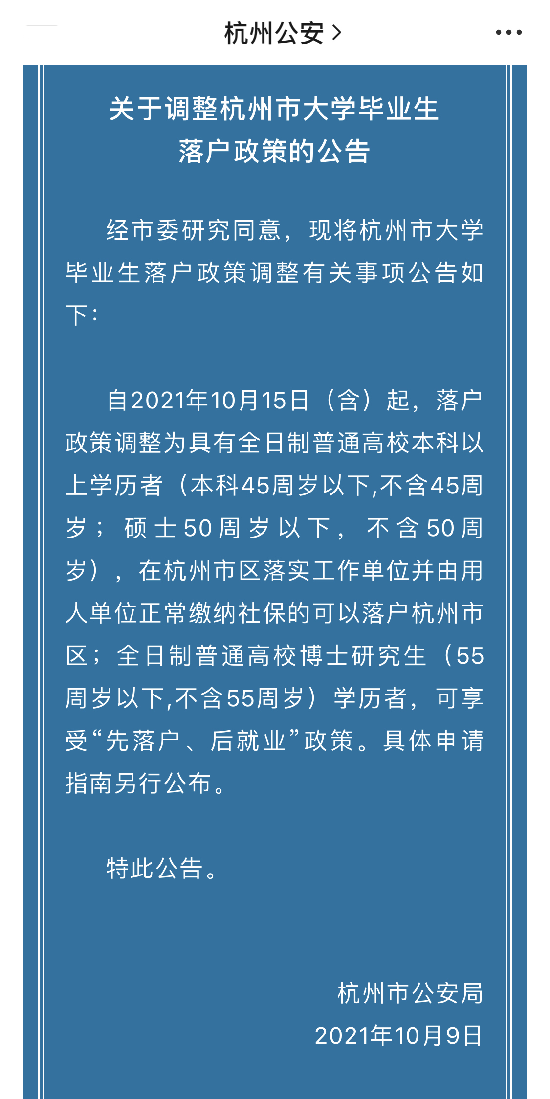 自2021年10月15日(含)起,落户政策调整为具有全日制普通高校本科以上学历者(本科45周岁以下,不含45周岁;硕士50周岁以下,不含50周岁),在杭州市区落实工作单位并由用人单位正常缴纳社保的可以落户杭州市区;全日制普通高校博士研究生(55周岁以下,不含55周岁)学历者,可享受“先落户、后就业”政策。具体申请指南另行公布。