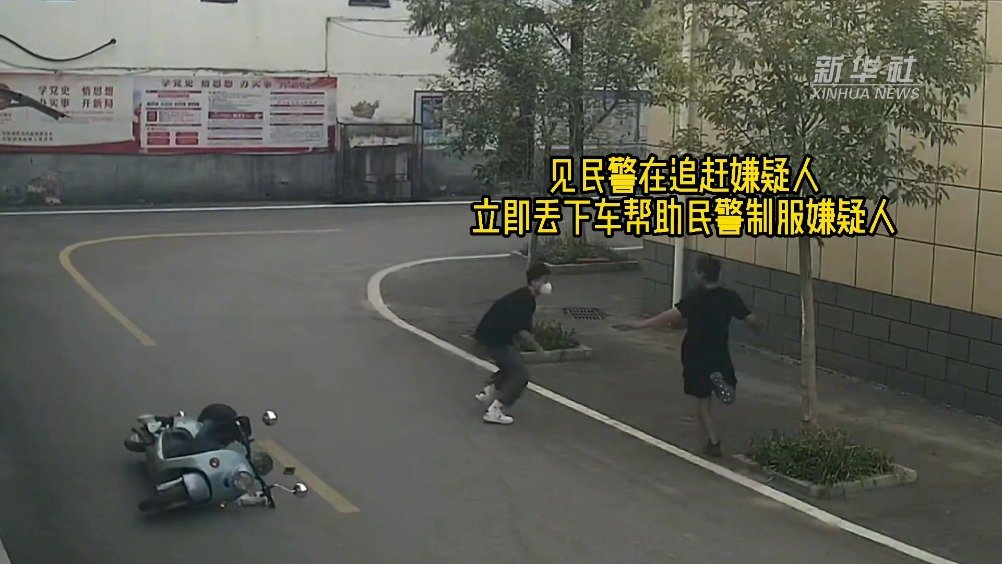 【#小伙弃车与民警共追违法嫌疑人#】不久前,安徽省滁州市凤阳县大庙镇一名涉嫌吸毒的男子从派出所逃走,正当民警追赶之时,一名骑车路过的小伙见状,弃车一同追赶,并飞身将男子扑倒。在小伙的帮助下,民警成功将该男子制服,监控画面还原了这一过程。为小伙点赞!(记者陈诺) 新华社的微博视频