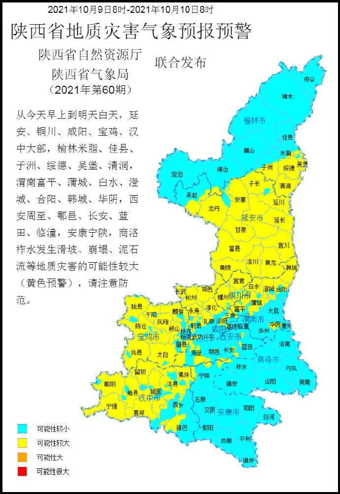 9日,陕西省自然资源厅与陕西省气象局联合发布地质灾害气象预报预警:预计10月9日8时至10日8时,延安、铜川、咸阳、宝鸡、汉中大部,榆林米脂、佳县、子洲、绥德、吴堡、清涧,渭南富平、蒲城、白水、澄城、合阳、韩城、华阴,西安周至、鄠邑、长安、蓝田、临潼,安康宁陕,商洛柞水发生滑坡、崩塌、泥石流等地质灾害的可能性较大(黄色预警)。