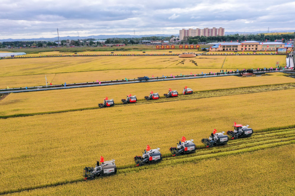 △在吉林省长春市九台区龙嘉街道红光村,农民驾驶农机进行水稻收割作业(无人机照片,2021年9月23日摄)。