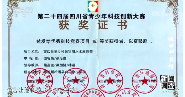 2008年一个偶然的机会,谭加健接触到了一次保护水资源的创新教育活动,他深受启发。回到学校他便试着和孩子们一起进行白羊乡水质调查科技实践活动,没想到2009年,这项调查结论被四川省第二十届青少年科技创新大赛评为二等奖,这让他和孩子们深受鼓舞。