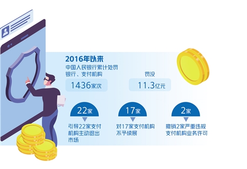 在日前召开的第十届中国支付清算论坛上,中国人民银行副行长范一飞表示,2016年以来,中国人民银行累计处罚银行、支付机构1436家次,罚没11.3亿元;引导22家支付机构主动退出市场,对17家支付机构不予续展,撤销2家严重违规支付机构业务许可,行业优胜劣汰的市场退出机制初步形成。