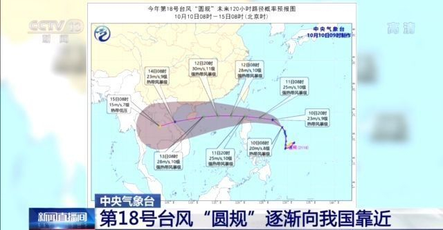 今年第18号台风“圆规”的中心,今天8时位于菲律宾马尼拉偏北方向约890公里处。“圆规”将以每小时25公里左右的速度向西北方向移动,强度缓慢增强。预计,“圆规”将于11日夜间进入南海东北部,然后向粤西到海南岛东部一带沿海靠近。受其影响,今天浙江东部、台湾岛等地部分地区有中到大雨。