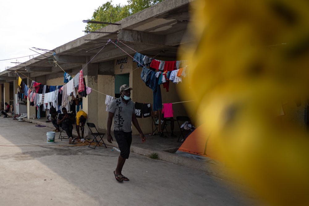 9月29日,滞留美墨边境的移民走在墨西哥阿库尼亚城的一处收容所内。(新华社记者辛悦卫摄)