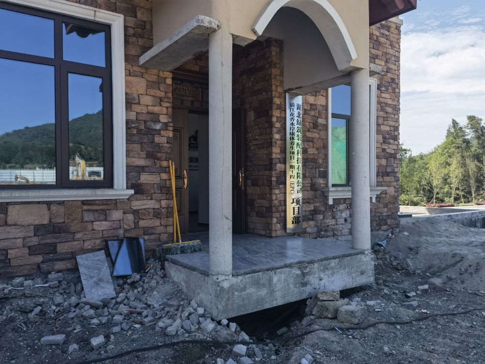 在山体旁边有三栋孤零零的别墅建筑,挂着“清江花香水岸康体养生一期工程项目部”的牌子。房内空空如也,墙边散落着不少碎石。