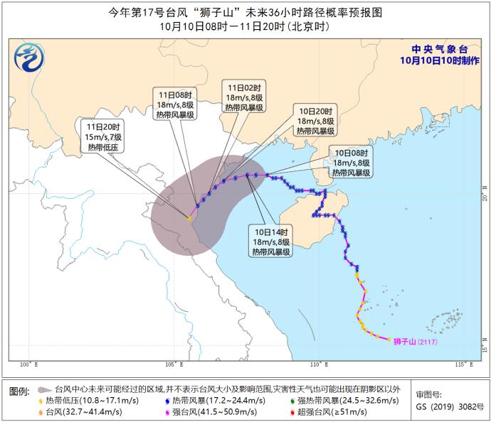 据海南省气象局消息,今年第17号台风“狮子山”(热带风暴级),10日9时其中心位于北纬20.8度,东经107.8度,也就是在北部湾北部海面,中心附近最大风力8级(18米/秒),中心最低气压为990百帕。预计,“狮子山”将以每小时15公里左右的速度向西偏南方向移动,趋向越南北部,强度变化不大。由于“狮子山”逐渐远离海南岛,对海南省影响逐渐减弱,海南省气象局10月10日10时50分解除台风四级预警。