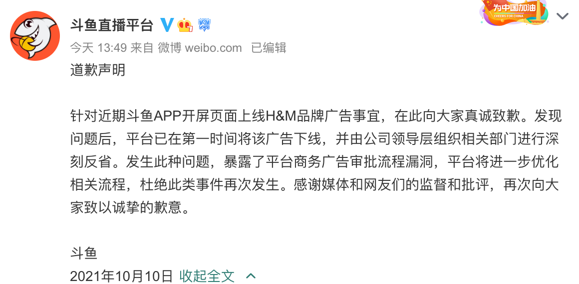针对近期斗鱼APP开屏页面上线H&M品牌广告事宜,在此向大家真诚致歉。发现问题后,平台已在第一时间将该广告下线,并由公司领导层组织相关部门进行深刻反省。发生此种问题,暴露了平台商务广告审批流程漏洞,平台将进一步优化相关流程,杜绝此类事件再次发生。感谢媒体和网友们的监督和批评,再次向大家致以诚挚的歉意。