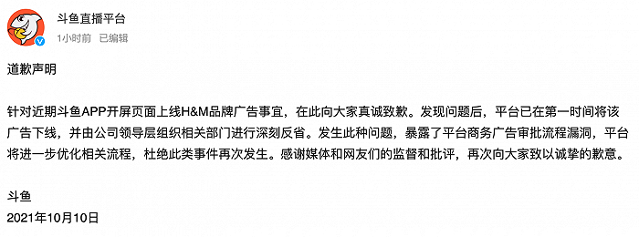 10月10日,斗鱼在其官方微博@斗鱼直播平台 发布致歉声明。斗鱼表示,针对近期斗鱼APP开屏页面上线H&M品牌广告事宜,在此向大家真诚致歉。发现问题后,平台已在第一时间将该广告下线,并由公司领导层组织相关部门进行深刻反省。发生此种问题,暴露了平台商务广告审批流程漏洞,平台将进一步优化相关流程,杜绝此类事件再次发生。感谢媒体和网友们的监督和批评,再次向大家致以诚挚的歉意。