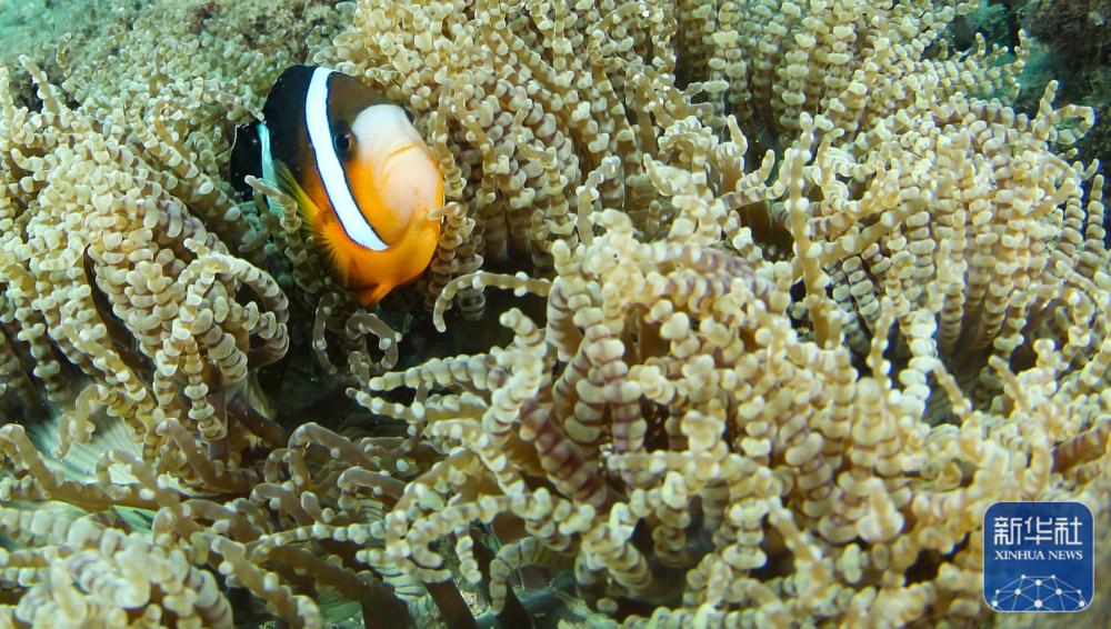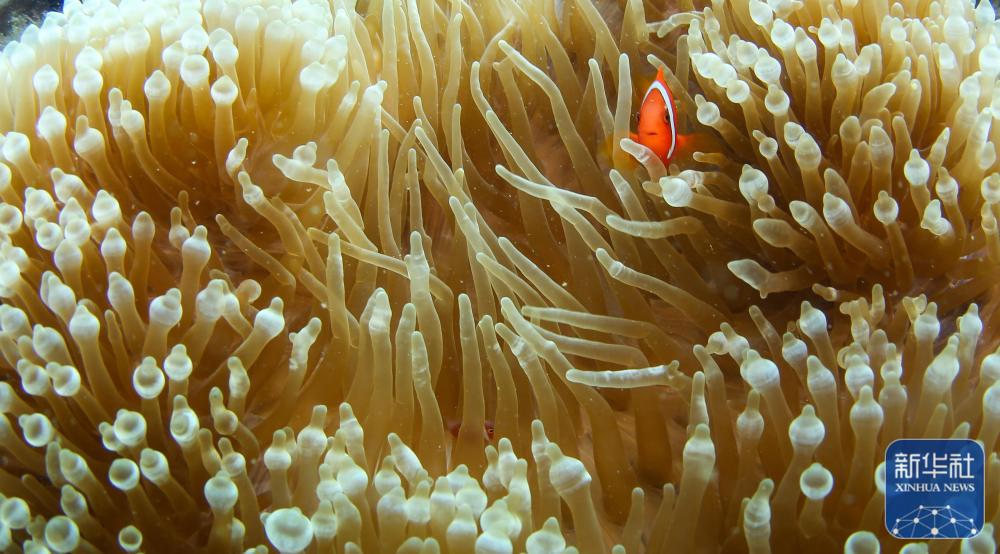 ↑这是在分界洲岛海域拍摄的海葵内的小丑鱼(9月28日摄)。新华社记者 杨冠宇 摄
