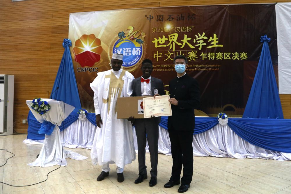 7月23日,在乍得首都恩贾梅纳,中国驻乍得大使李津津(右)为第20届“汉语桥”世界大学生中文比赛乍得赛区冠军佛朗哥(中)颁奖。(中国驻乍得大使馆供图)