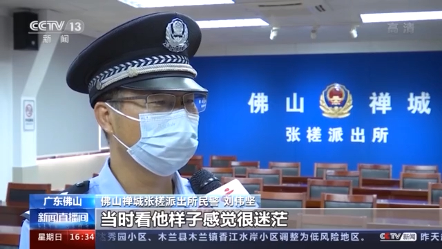 佛山禅城张槎派出所民警 刘伟坚:穿着背心,短裤,一双运动鞋,当时看他样子感觉很迷茫,站在那里哭,旁边也没其他大人在,一个人孤零零的。