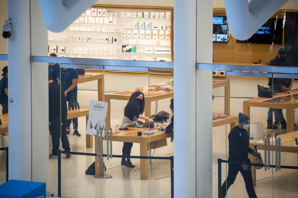 1月28日,美国纽约一家苹果商店的员工为顾客服务。(新华社发,郭克摄)