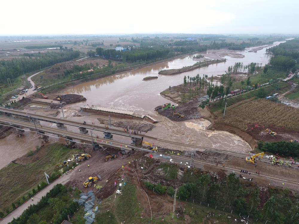 10月8日无人机拍摄的南同蒲铁路昌源河大桥抢修现场(新华社发)