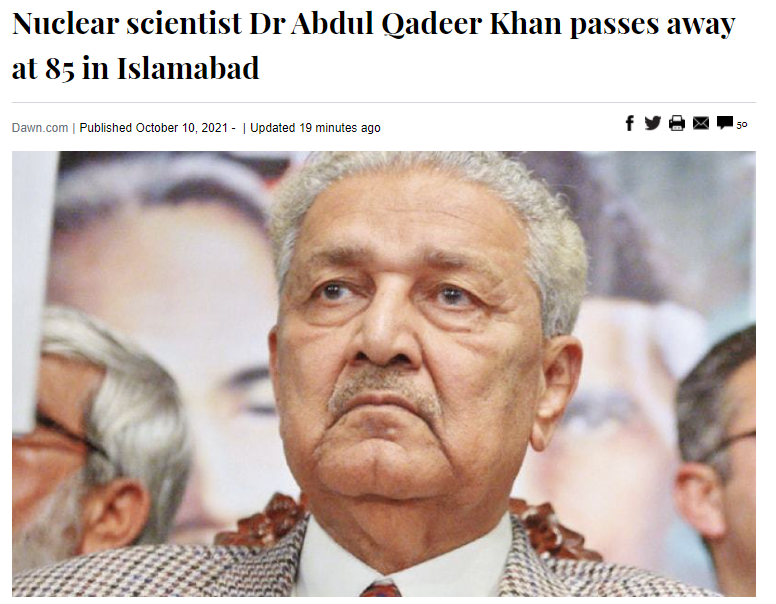 综合巴基斯坦国家广播电台、《黎明报》10日报道,巴基斯坦“核弹之父”阿卜杜勒·卡迪尔·汗于当地时间10日上午在伊斯兰堡去世,终年85岁。