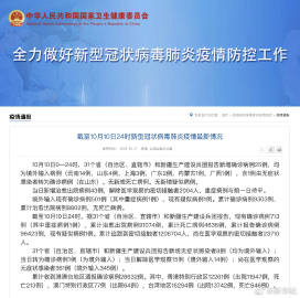 截至10月10日24时,据31个省(自治区、直辖市)和新疆生产建设兵团报告,现有确诊病例713例(其中重症病例1例),累计治愈出院病例91074例,累计死亡病例4636例,累计报告确诊病例96423例,现有疑似病例1例。累计追踪到密切接触者1206704人,尚在医学观察的密切接触者23710人。