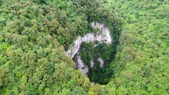 经过一番跋涉,团队终于来到了海拔1800米的大天坑坑口。从上面看,天坑坑壁大约有50到100米高,坑底宽阔,具有巨大的容积。