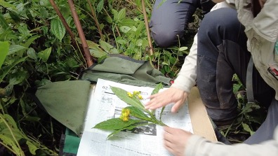 路遇一株高大的凤仙花,团队决定采集制作一份凭证标本。专家介绍,在野外,一份凭证标本的采集制作大概需要经过拍照、采集、数据登记、初步压制等步骤。