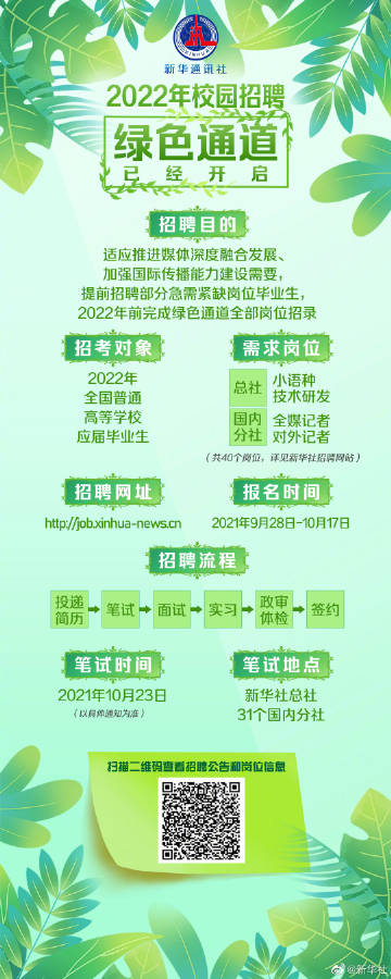 【#新华社2022年校园招聘#绿色通道启动啦!】新华社面向2022年应届高校毕业生开启校园招聘“绿色通道”,公开招考总社和国内分社部分岗位工作人员,包括总社小语种、技术研发类岗位,国内分社全媒记者、对外记者岗位共40个。戳图↓↓↓查看报名时间和招聘流程。“90后”的国社欢迎“90后”的你一起干一番大事业!