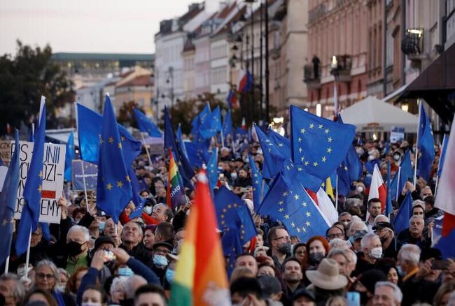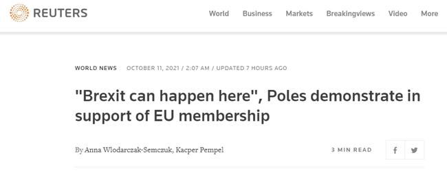 【环球网报道】波兰与欧盟的司法管辖权之争不断升级,引发外界对波兰可能"脱欧"的猜测。据路透社11日报道,超10万波兰人当地时间10日举行抗议活动,支持波兰留在欧盟。