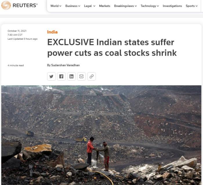 随着煤炭库存的减少,印度多邦遭遇停电。图片来源:路透社报道截图。