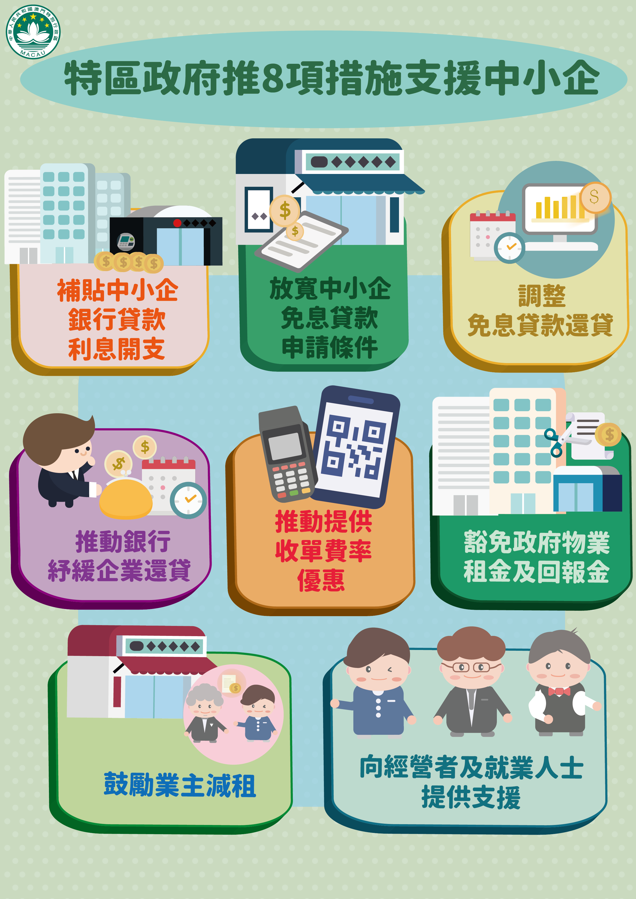 具体措施包括:一、补贴中小企银行贷款利息开支;二、放宽中小企免息贷款申请条件;三、调整免息贷款还贷;四、推动银行纾缓企业还贷;五、推动提供收单费率优惠;六、豁免政府物业租金及回报金;七、鼓励业主减租;八、向经营者及就业人士提供支援。