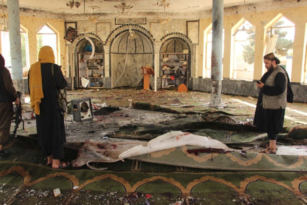 10月8日,阿富汗塔利班成员在昆都士查看清真寺爆炸现场。(新华社发,阿杰马勒·卡卡尔摄)