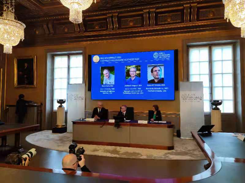 当地时间10月11日,瑞典皇家科学院将2021年诺贝尔经济学奖一半授予大卫·卡德,因他对“劳动经济学的实证”贡献;另一半授予约书亚·安格里斯特和吉多·伊本斯,表彰他们对“因果关系分析的方法论”贡献。(总台记者 郝晓丽)