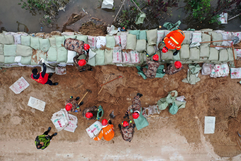10月10日,在山西省河津市阳村街道连伯村,抢险人员在加固临时堤坝(无人机照片)。 新华社记者 詹彦 摄