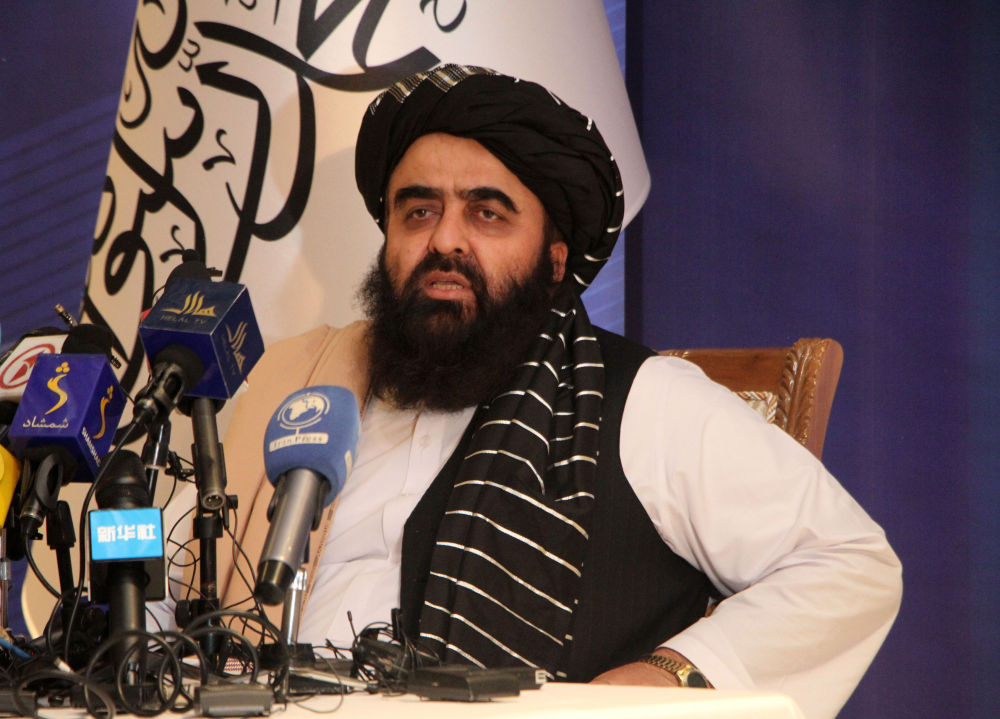 9月14日,阿富汗临时政府代理外交部长阿米尔·汗·穆塔基在阿首都喀布尔出席记者会。(新华社发,塞夫拉赫曼·萨菲摄)