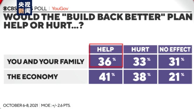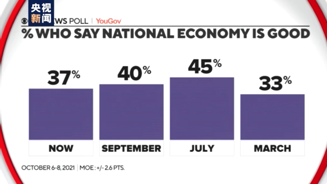 美国哥伦比亚广播公司于10月6日到8日在2054名美国成年人中进行了民调,结果显示,只有37%的美国人认为美国经济状况非常好或比较好,这是自今年3月以来的最低值。