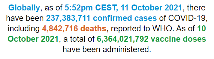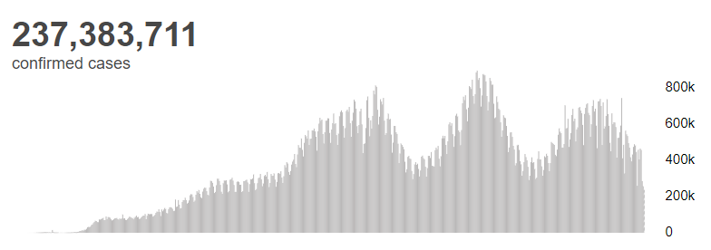 世界卫生组织11日公布的最新数据显示,全球累计新冠确诊病例达237383711例。