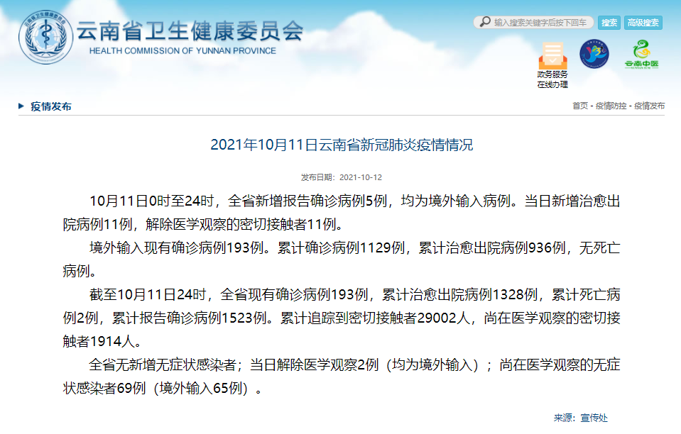 10月11日0时至24时,云南省新增报告确诊病例5例,均为境外输入病例。当日新增治愈出院病例11例,解除医学观察的密切接触者11例。