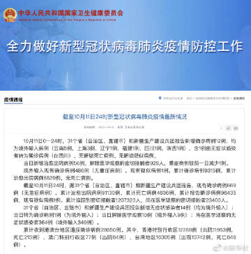 截至10月11日24时,据31个省(自治区、直辖市)和新疆生产建设兵团报告,现有确诊病例669例(无重症病例),累计治愈出院病例91130例,累计死亡病例4636例,累计报告确诊病例96435例,现有疑似病例1例。累计追踪到密切接触者1207323人,尚在医学观察的密切接触者23400人。