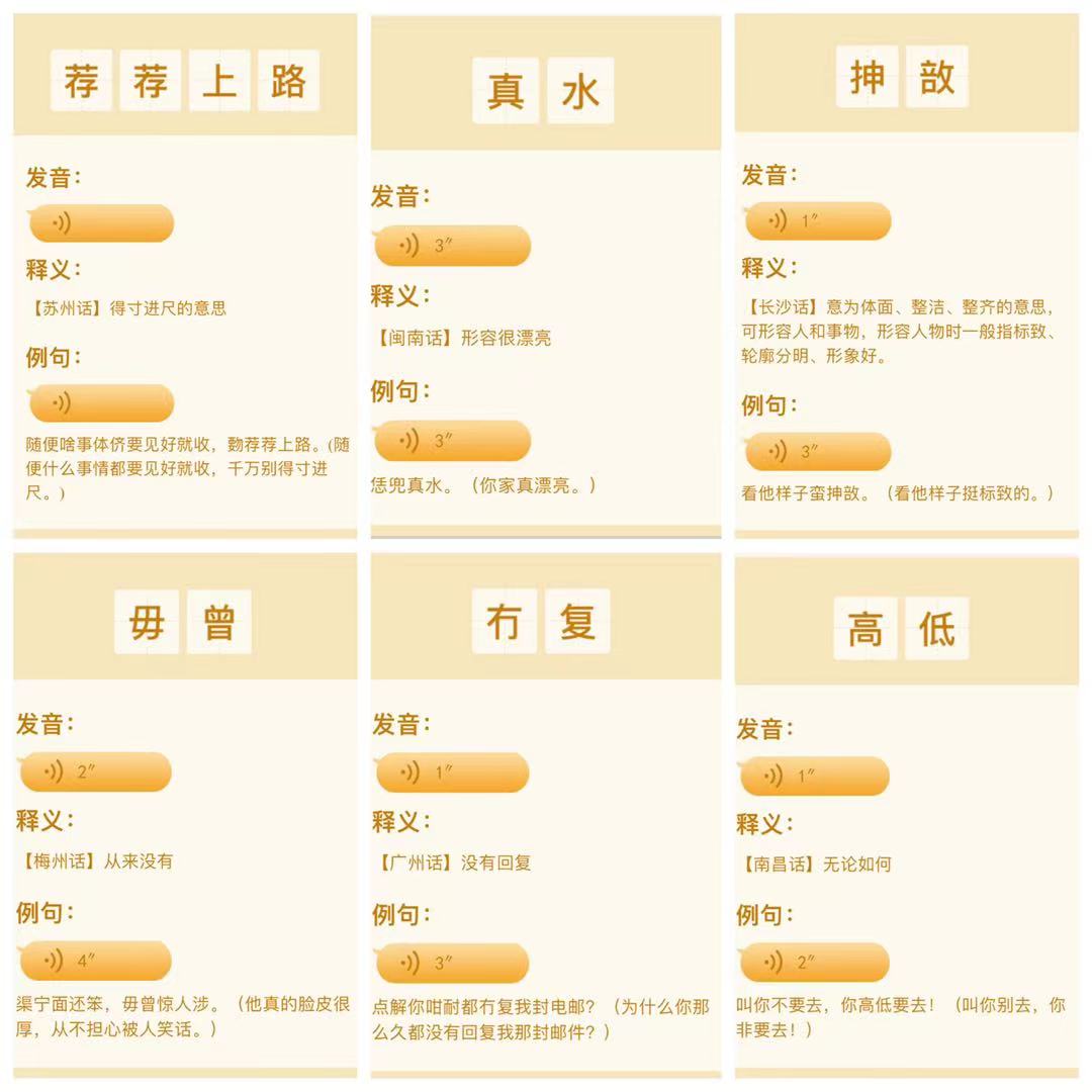 同时还有方言特色词语的释义和发音,能听、能看、能学,可谓知识点满满。