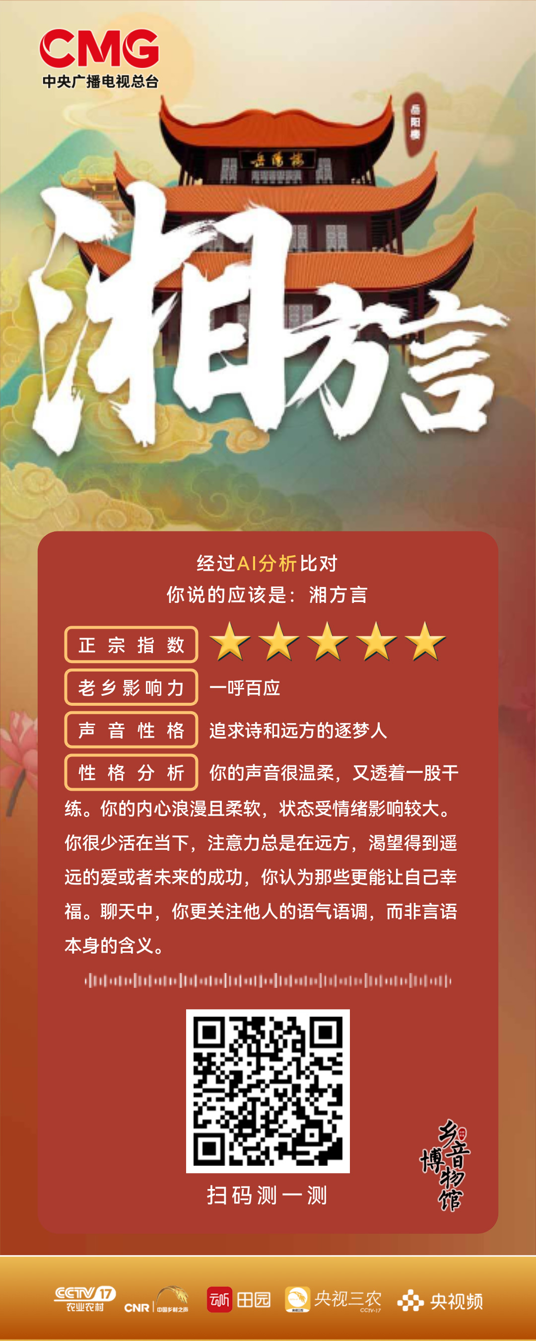 你的方言发音标准么?你的声音属于什么类型?为了解锁神秘的声音密码,《乡音博物馆》运用AI识别技术,推出了乡音小测试“离家久了,你的乡音还正宗吗?”。