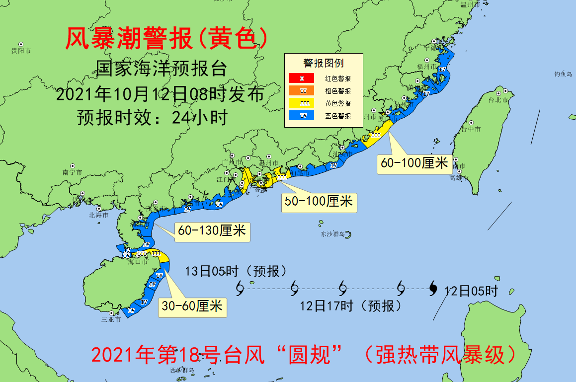 风暴潮方面,预计10月12日上午至13日上午,福建福州到漳州沿海将出现60到100厘米的风暴增水,广东潮州至阳江沿海将出现50到100厘米的风暴增水,广州茂名到湛江沿海将出现60到130厘米的风暴增水,海南岛北部和东部沿海将出现30到60厘米的风暴增水。上述岸段内的福建东山潮位站将于12日下午出现达到当地黄色警戒潮位的高潮位,广东惠州、盐田、横门和海南秀英潮位站将于13日凌晨出现达到当地黄色警戒潮位的高潮位,广东汕头、汕尾、赤湾、黄埔、珠海、北津和水东潮位站将于13日凌晨出现达到当地蓝色警戒潮位的高潮位,广东海安潮位站将于13日上午出现达到当地蓝色警戒潮位的高潮位。福建省漳州市、广东省惠州市、深圳市、中山市和海南省海口市的风暴潮预警级别为黄色,广东省汕头市、汕尾市、广州市、珠海市、阳江市、茂名市和湛江市的风暴潮预警级别为蓝色。