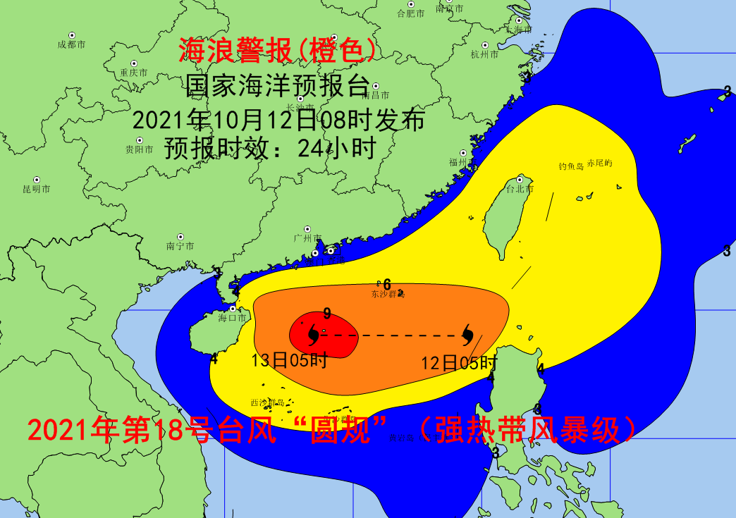 记者从自然资源部获悉,今年第18号台风“圆规”(强热带风暴级)已进入我国南海,受台风和冷空气的共同影响,南海北部海域将出现狂浪到狂涛,浙江、福建、广东、海南近岸海域将掀起大浪到巨浪,国家海洋预报台今天(12日)上午将海浪警报级别升级为橙色,并继续发布风暴潮黄色警报。