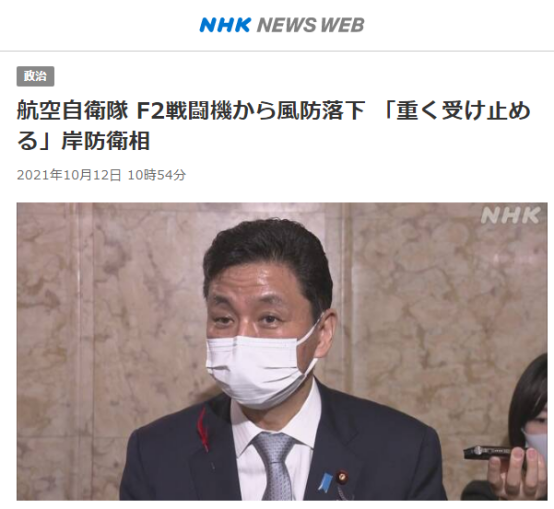 【环球网报道 记者 林泽宇】日本广播协会(NHK)12日消息,针对自卫队F2战机座舱盖日前意外掉落一事,日本防卫大臣岸信夫12日回应称,“像本次这种部件掉落事故可能会带来很大的危险,(防卫省)非常重视”,将尽快调查事故发生原因。