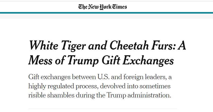 《纽约时报》称,当时,特朗普首次以总统身份出过访问。沙特王室向他赠送了80多份礼物,其中包括三件用白虎和猎豹皮毛制成的长袍以及一把握柄处似乎是象牙的匕首。