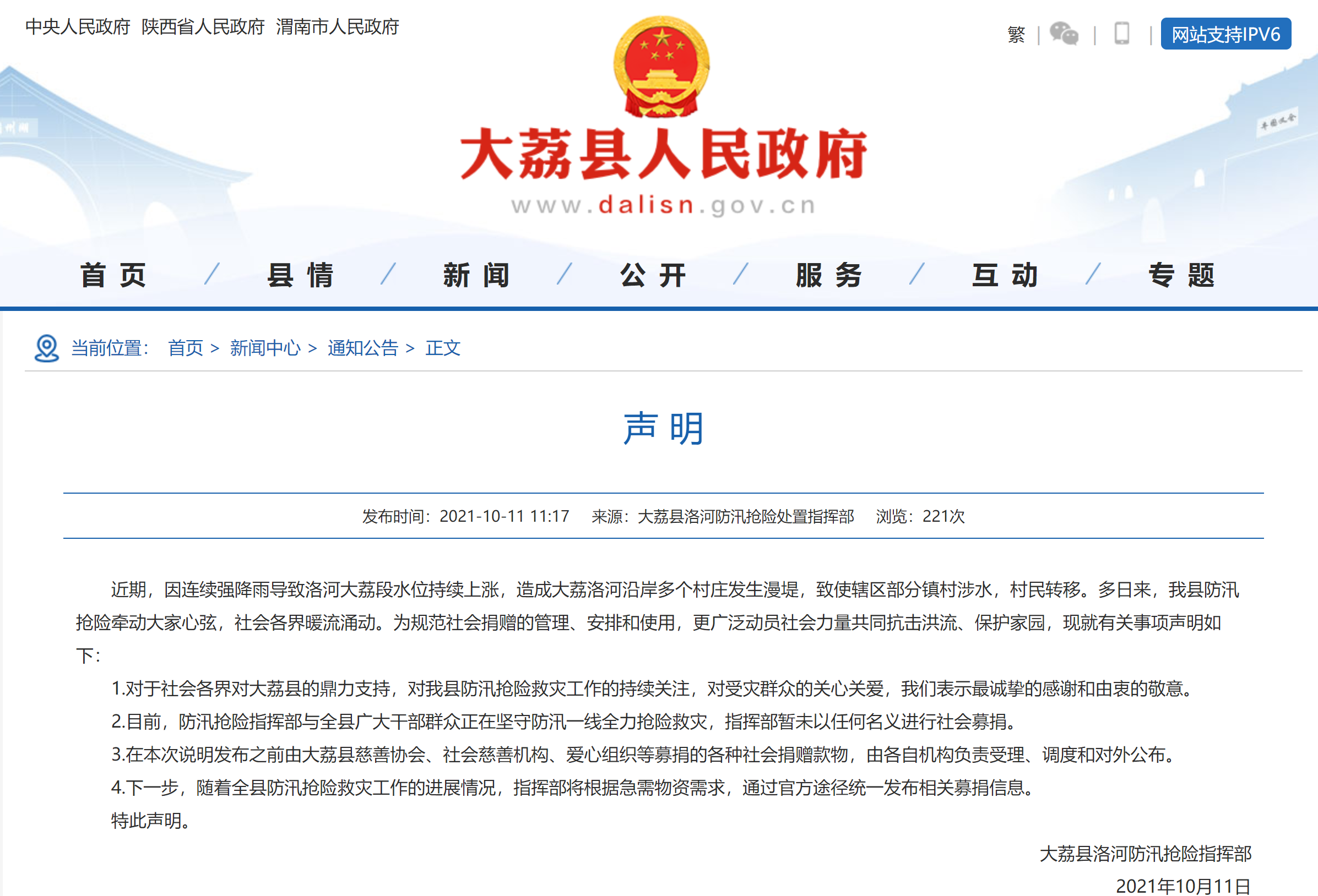 近日,陕西渭南大荔县遭遇持续强降雨,发生洪涝灾害。11日,大荔县人民政府发布声明表示,大荔县洛河防汛抢险指挥部暂未以任何名义进行社会募捐。