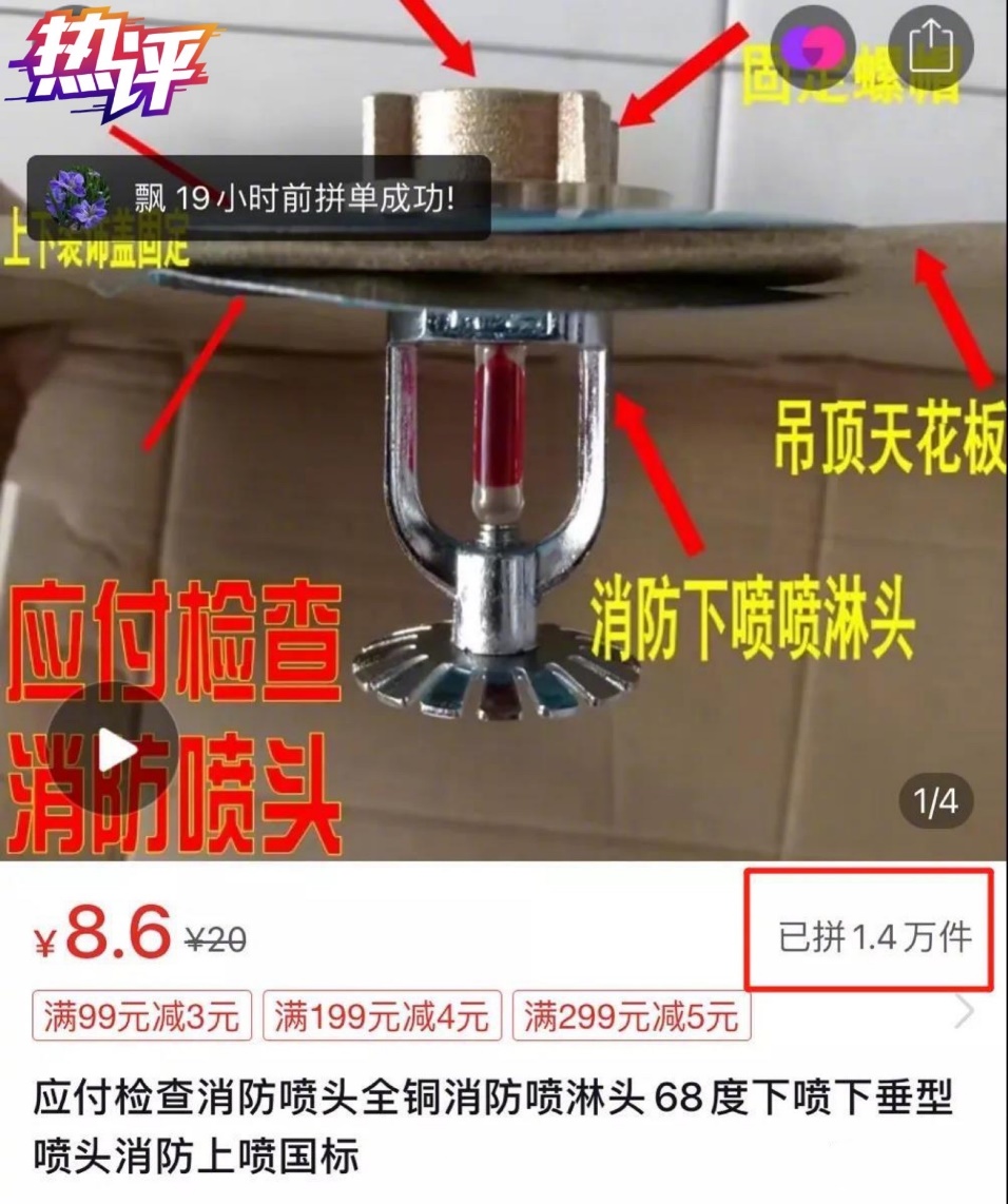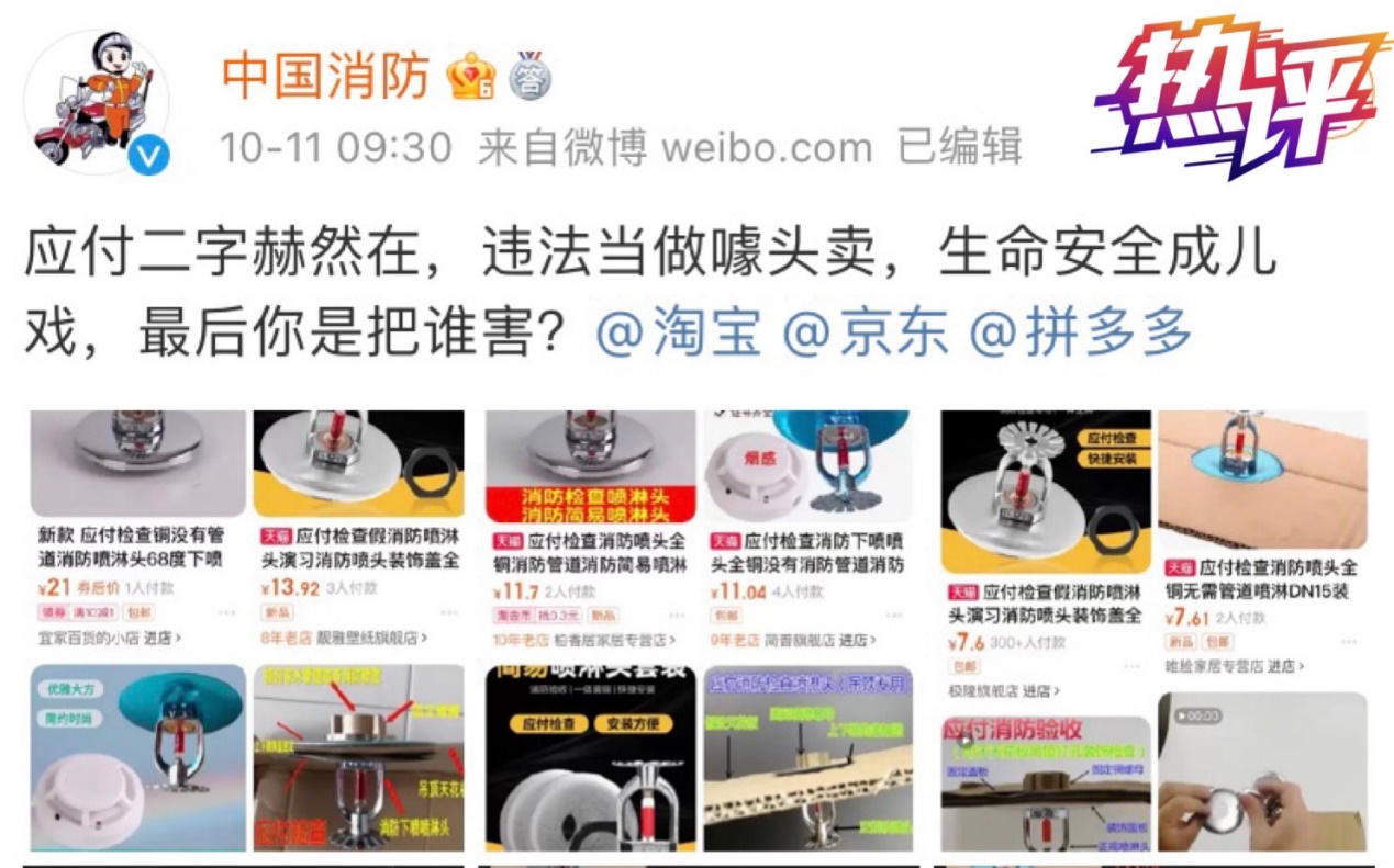针对淘宝、京东和拼多多平台上多家店铺售卖名为“应付检查假消防喷淋头”的货品,中国消防在官微怒斥:“应付二字赫然在,违法当做噱头卖,生命安全成儿戏,最后你是把谁害?”同时还艾特了三家平台,将这不光彩的一面公之于众。