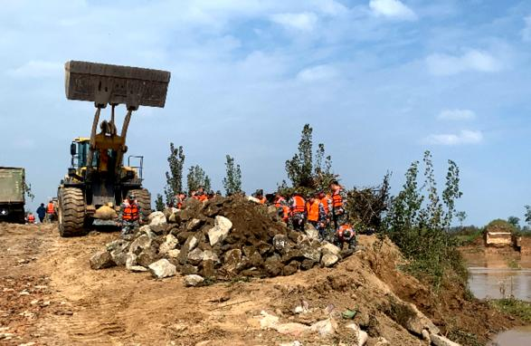 据介绍,连日来大荔县组织大量人力和机械,在紫阳漫堤决口抢险现场抢修道路、疏浚排水、封堵决口。目前,现场有近百辆卡车、装卸车、挖掘机、铲车、吊车等大型机械设备正在抓紧时间扩宽堤坝道路、扩大施工作业平台、投运砂石、土方,全力对洪水蔓延地段进行围坝堵塞,为全面封堵决口打基础。经过昼夜不停施工,朝邑镇紫阳决口围堤已由北向南推进24米,整体工作进展顺利,预计最快两天内就能封堵合拢。