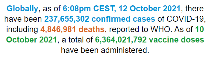 根据世卫组织最新实时统计数据,截至欧洲中部夏令时间10月12日18时08分(北京时间10月13日0时08分),全球累计新冠肺炎确诊病例237655302例,累计死亡病例4846981例。12日全球新冠肺炎确诊病例新增257154例,死亡病例新增4148例。(总台记者 朱赫)