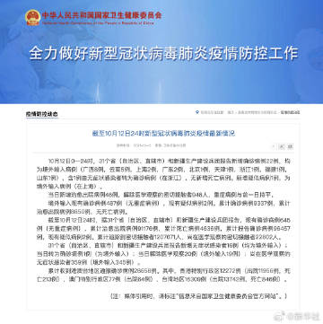 截至10月12日24时,据31个省(自治区、直辖市)和新疆生产建设兵团报告,现有确诊病例645例(无重症病例),累计治愈出院病例91176例,累计死亡病例4636例,累计报告确诊病例96457例,现有疑似病例2例。累计追踪到密切接触者1207671人,尚在医学观察的密切接触者22802人。