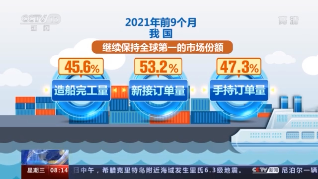 今年前九个月,我国造船完工量、新接订单量、手持订单量三大指标方面分别占全球的45.6%、53.2%和47.3%,继续保持全球第一的市场份额。