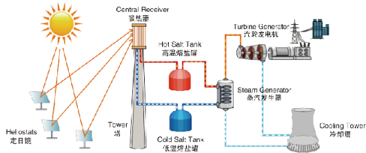 聚光系统熔盐塔式光热电站原理。资料图