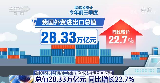 据海关统计,今年前三季度,我国外贸进出口总值28.33 万亿元,同比增长22.7%。其中,出口15.55万亿元,同比增长22.7%;进口12.78万亿元,同比增长22.6%。