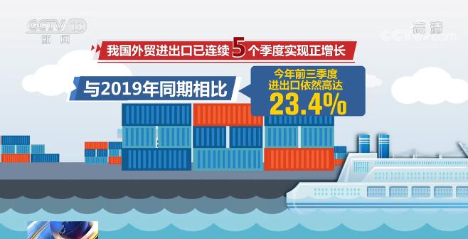 9月份当月,我国外贸进出口3.53万亿元,同比增长15.4%。我国外贸进出口已连续5个季度实现同比正增长,与2019年同期相比,今年前三季度的进出口增速依然高达23.4%。