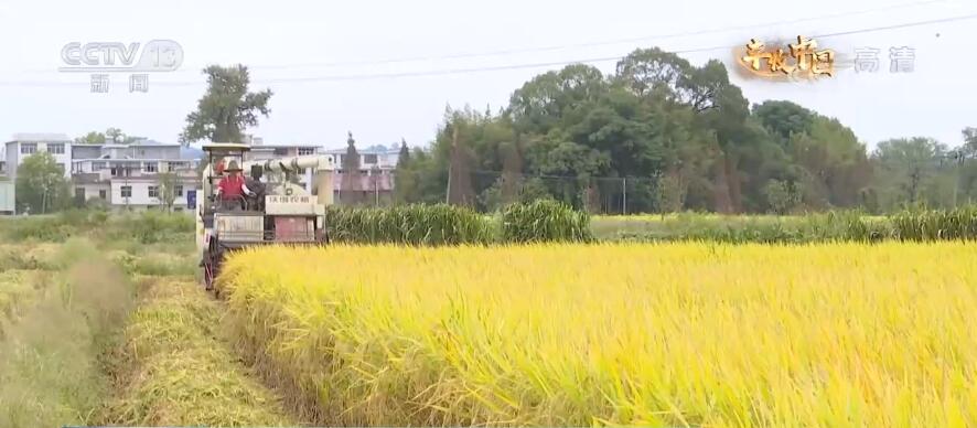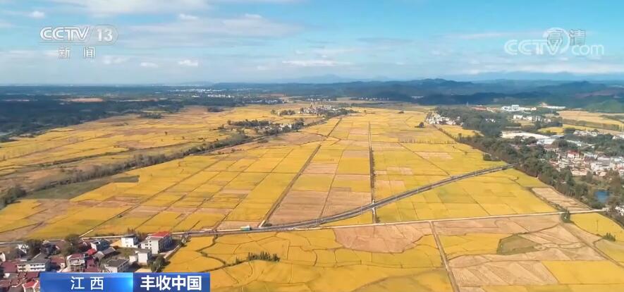 在江西宜春市宜丰县,20多万亩晚稻喜获丰收。金黄的稻田里,大型收割机忙碌穿梭,脱粒后的稻谷从收割机中倾泻而出堆成一座小山。