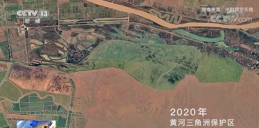 这是20年前卫星拍摄下的保护区模样,视线所及,遍布枯黄与干涸;而对比如今的景象,水量充足,满眼是绿色和生机。